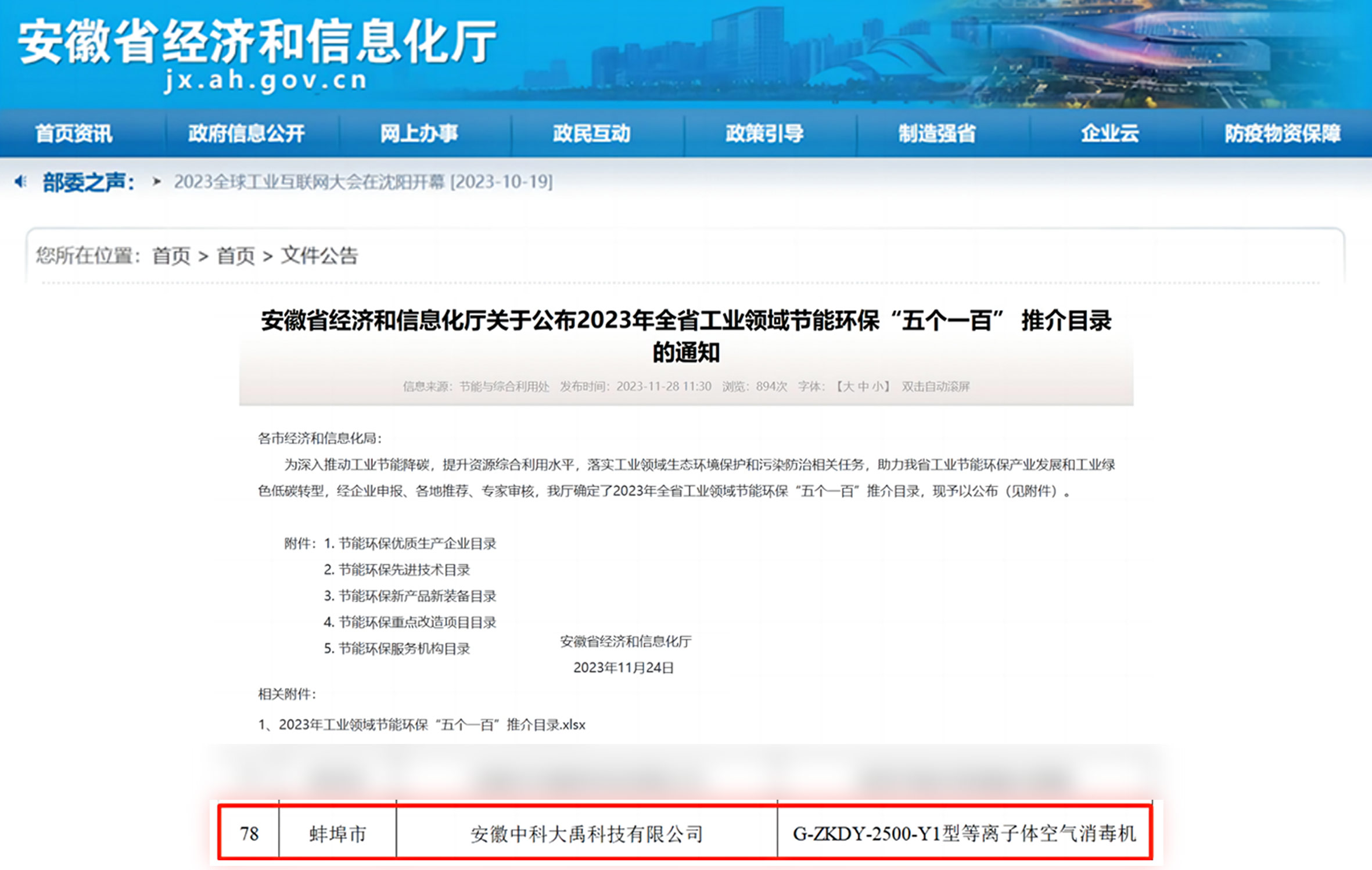 入選2023年全省工業領域節能環?!拔鍌€一百”推介目錄(節能環保新產品新裝備:G-ZKDY-2500-Y1型等離子體空氣消毒機)